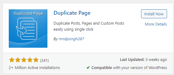We will be making use of the Duplicate Page Plugin in this article due to its easy configuration and use, it is also well maintained with over 2million plus installations, regular updates and has a good rating from the plugin directory as you can see below.
